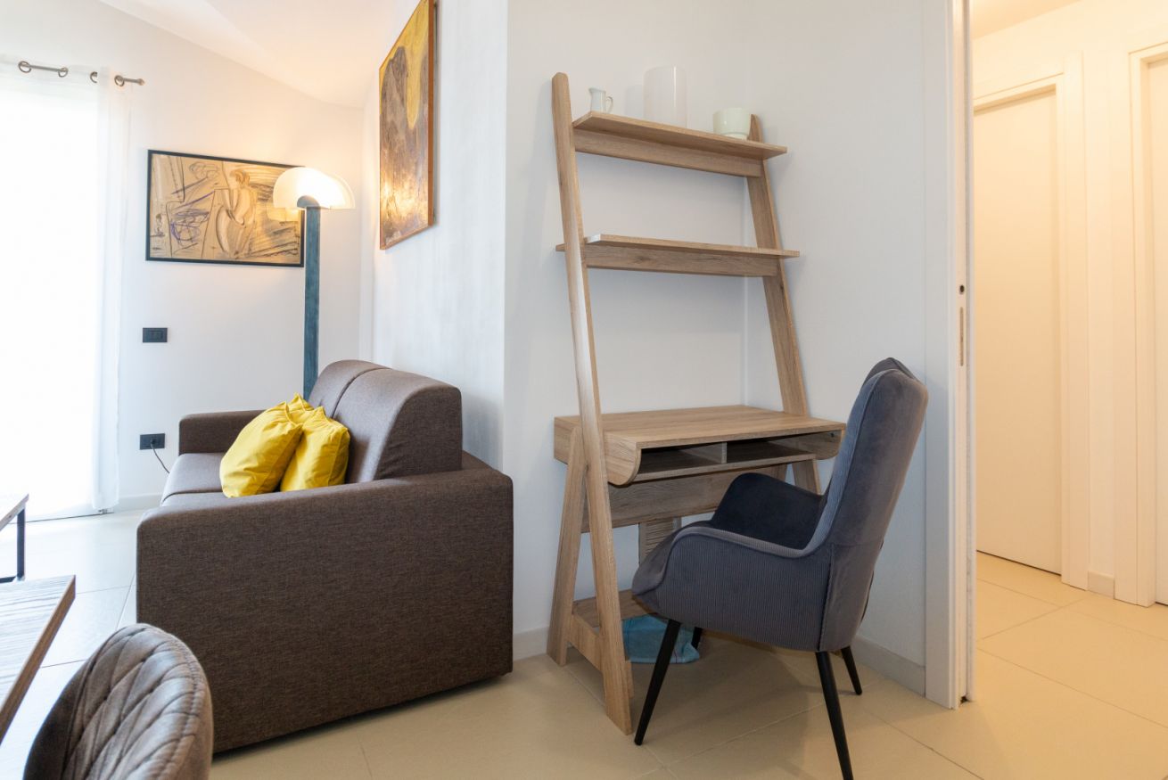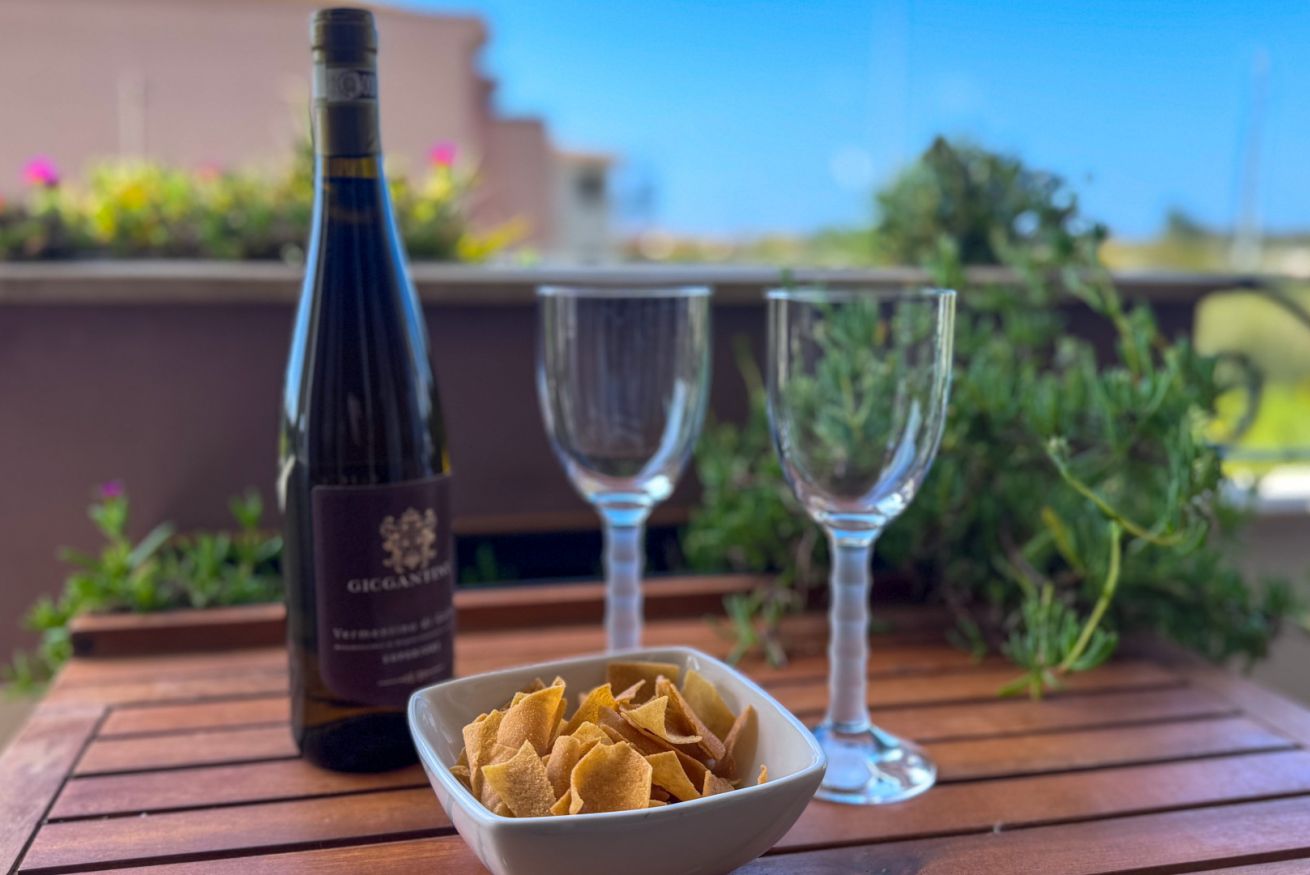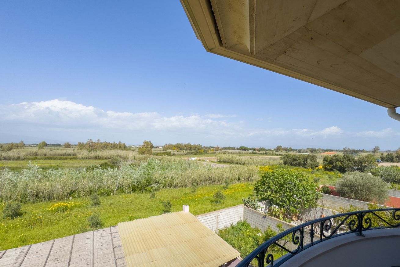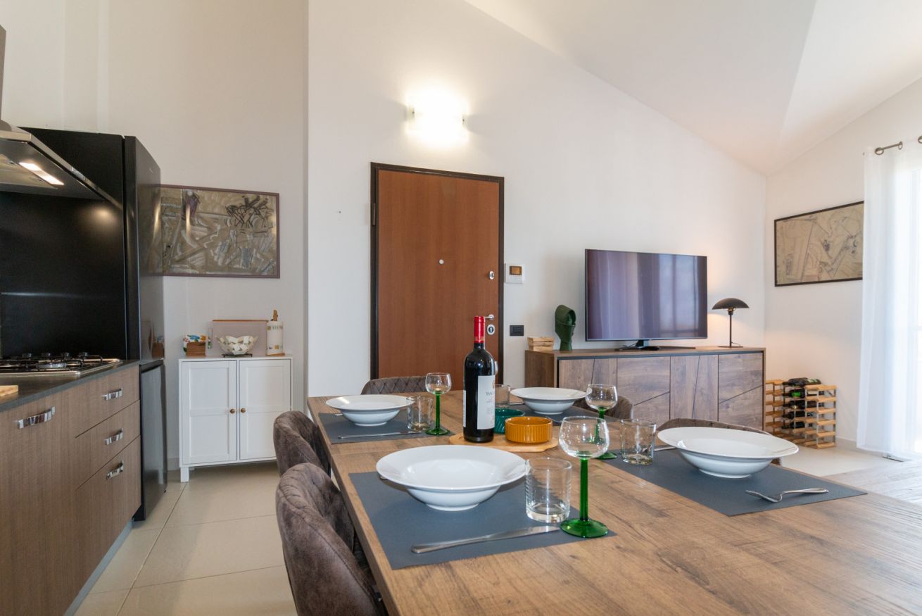 Un ampio soggiorno con accesso a un balcone attrezzato, perfetto per cenare all’aperto ammirando i tramonti sulle campagne di Cabras