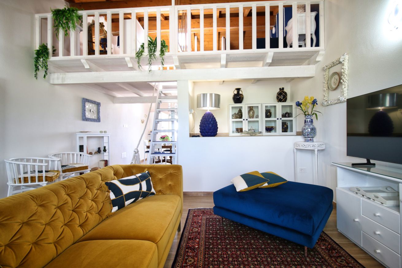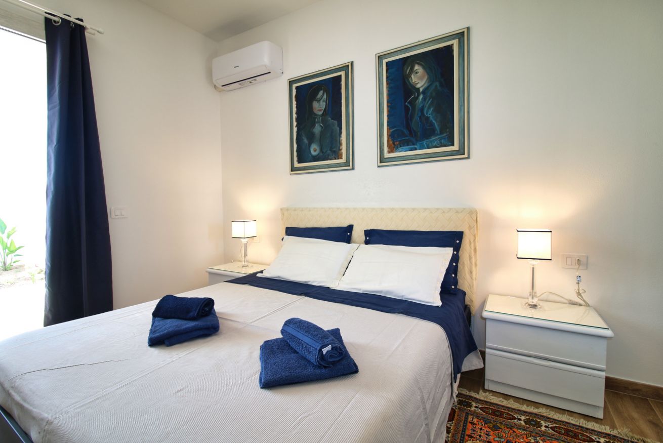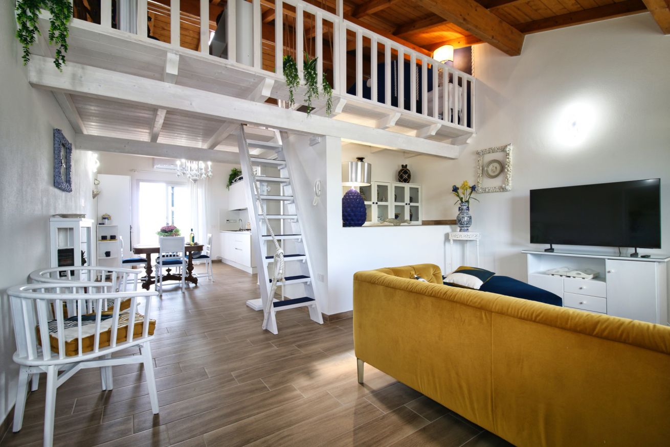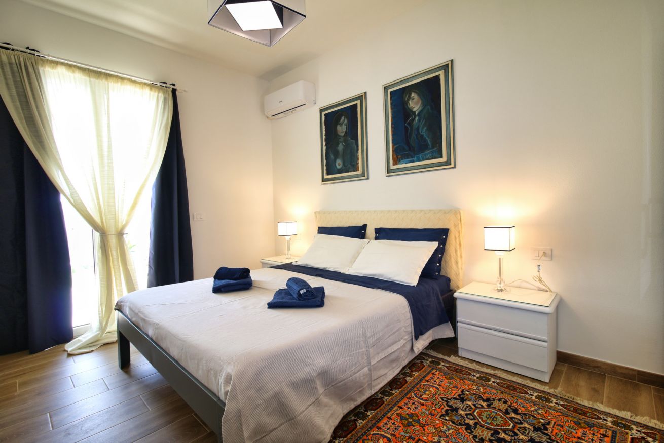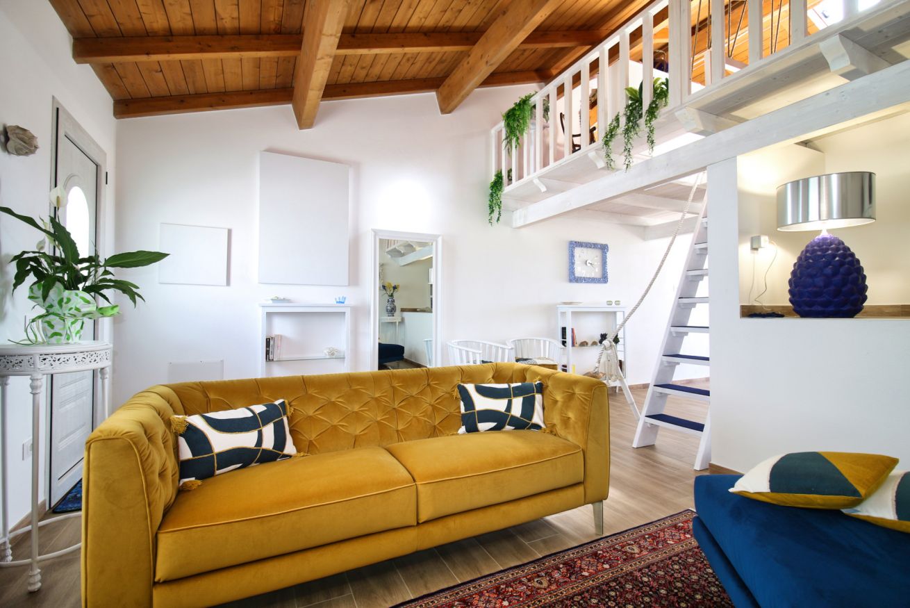 La villa dispone di due camere matrimoniali eleganti, due bagni moderni e un soppalco con divano letto, ideale anche come angolo lettura o spazio relax.