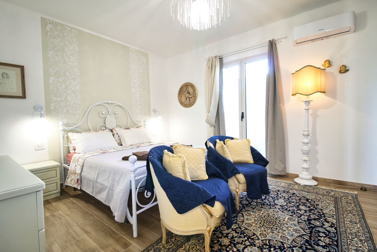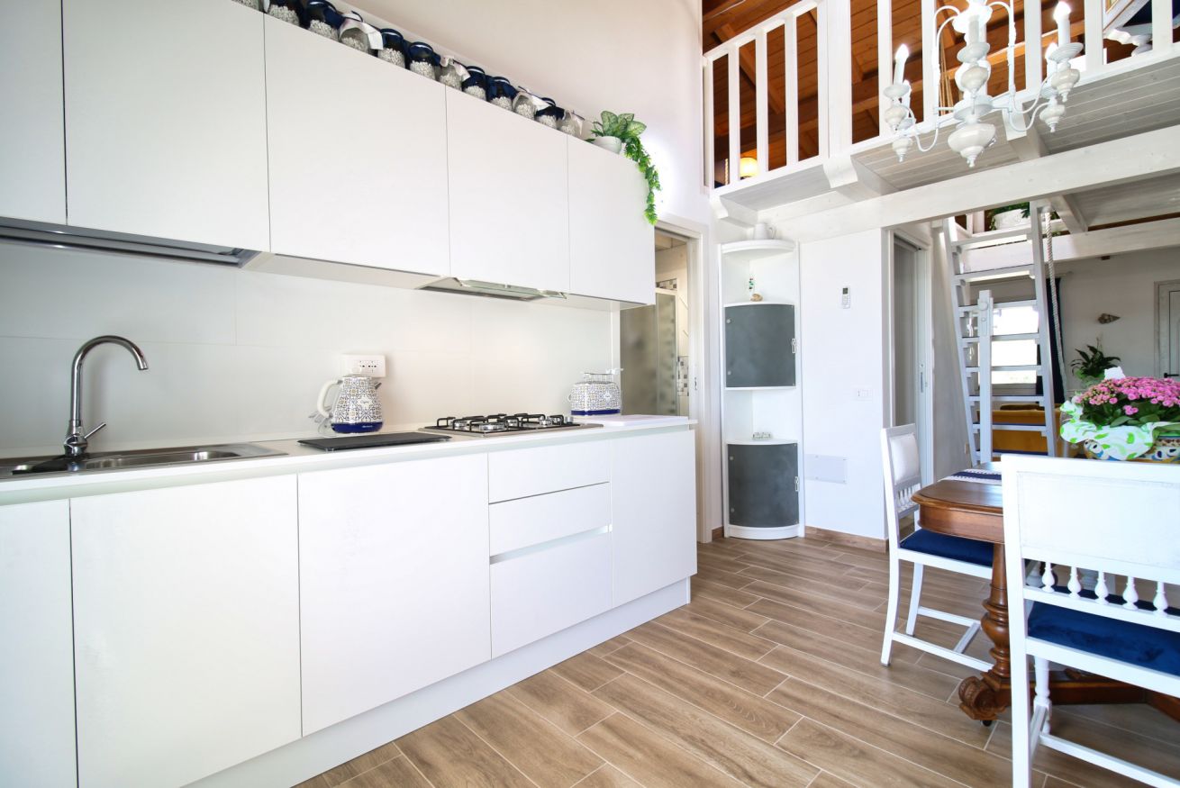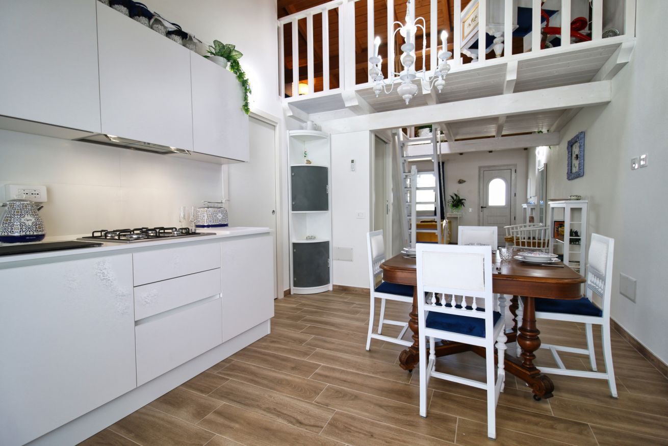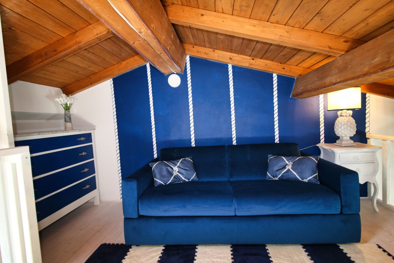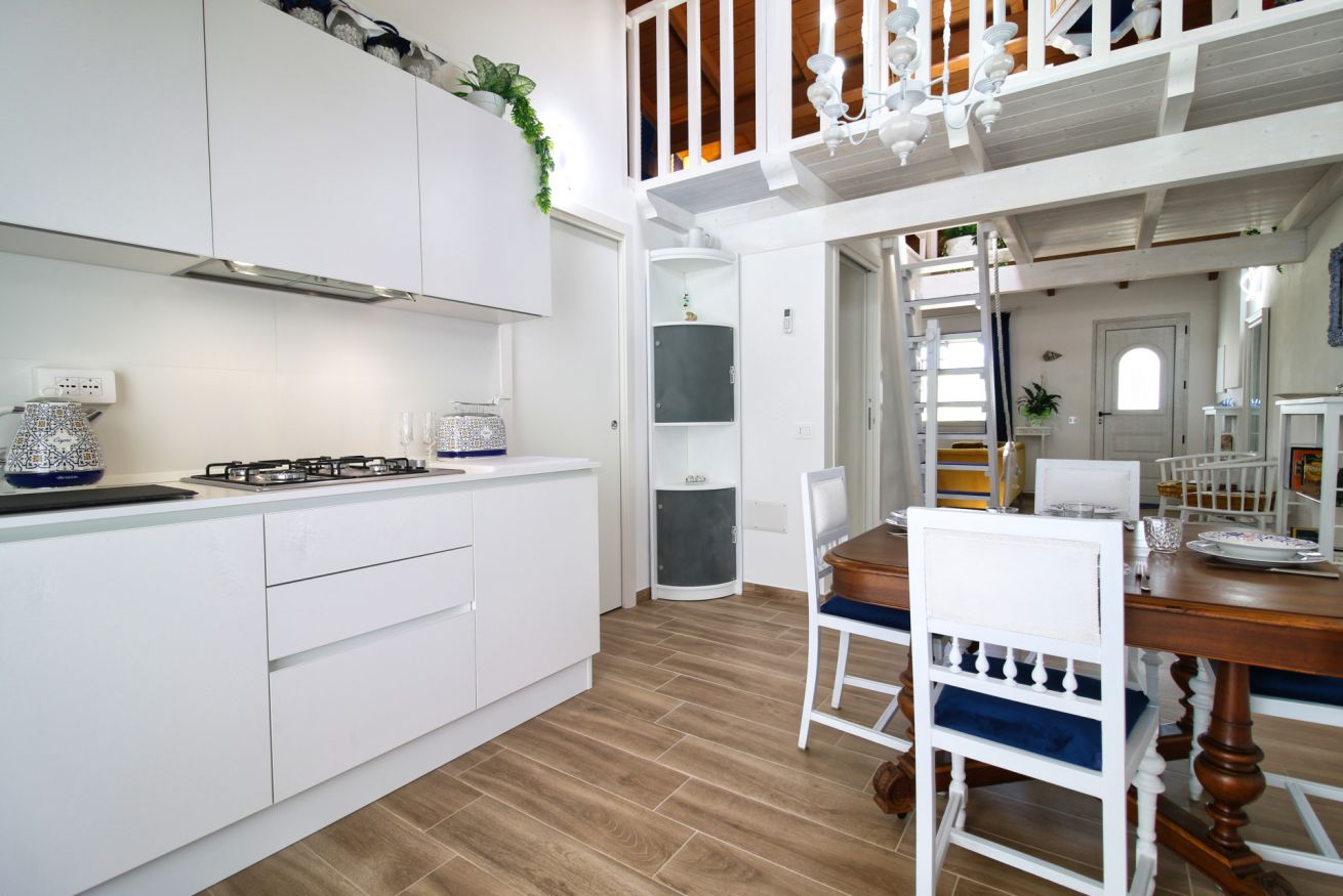 La villa dispone di due camere matrimoniali eleganti, due bagni moderni e un soppalco con divano letto, ideale anche come angolo lettura o spazio relax.