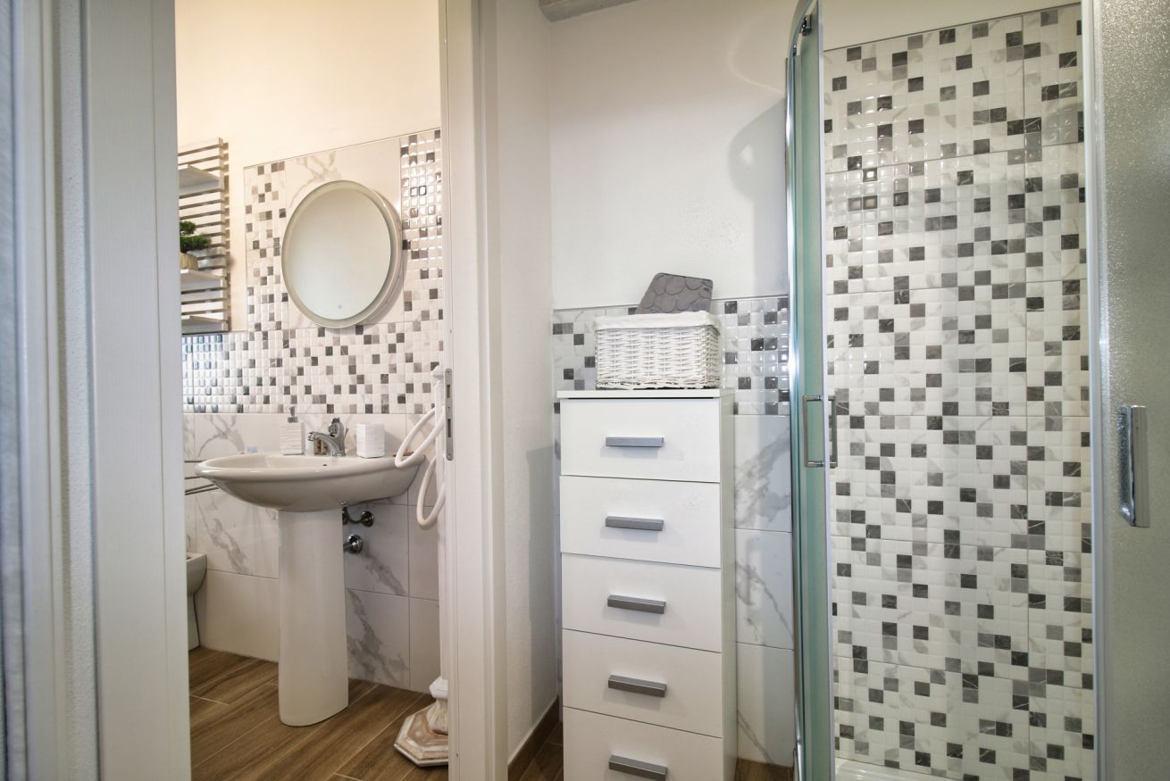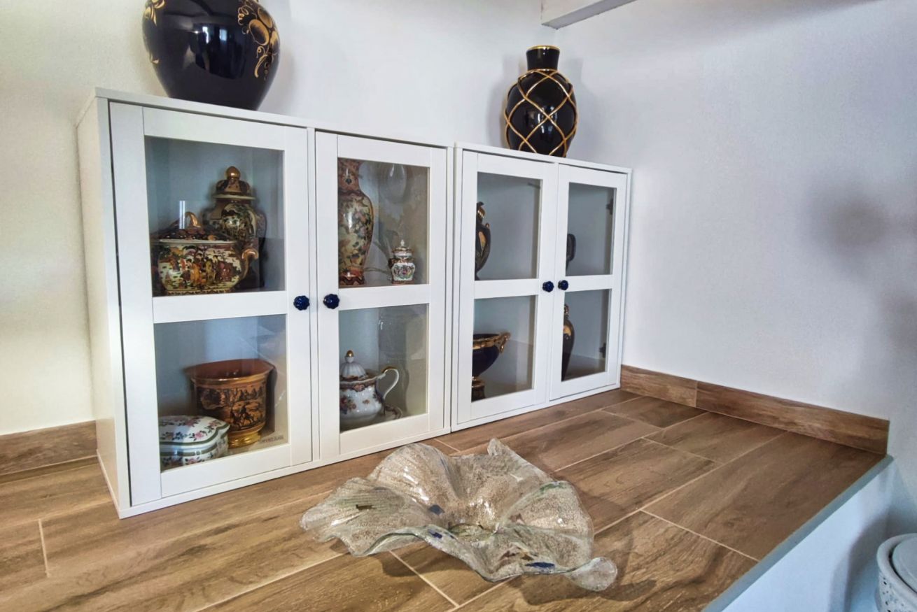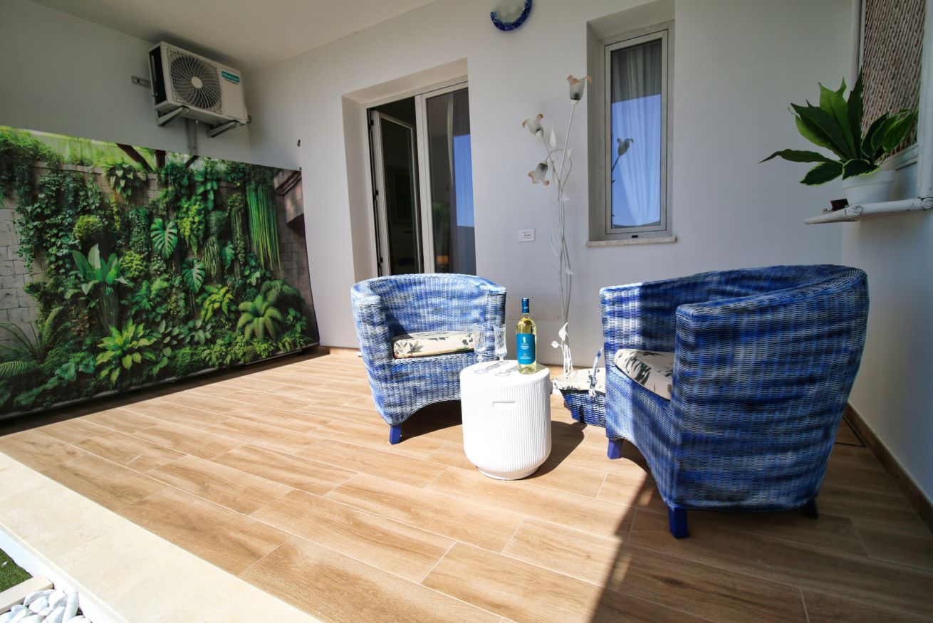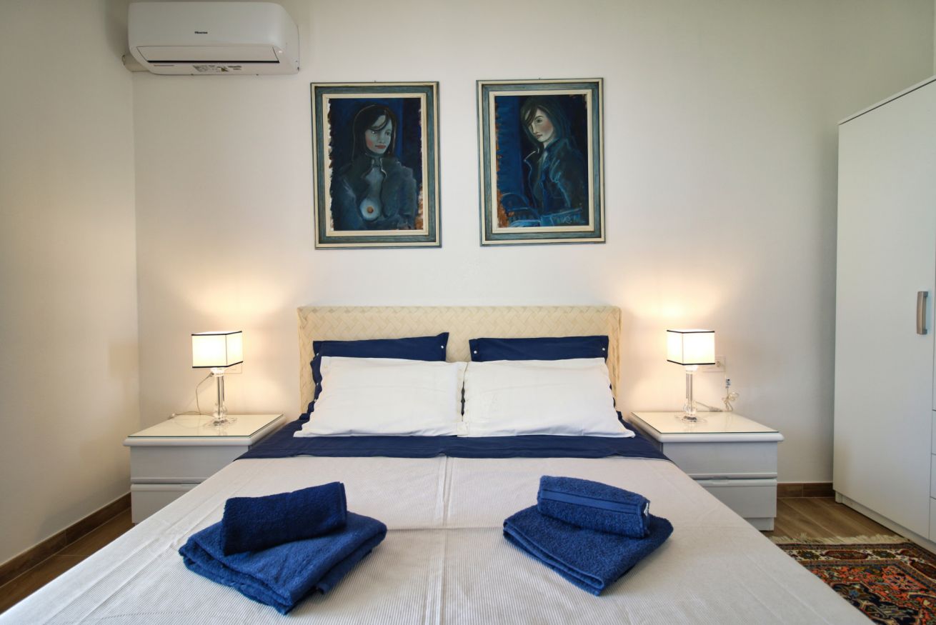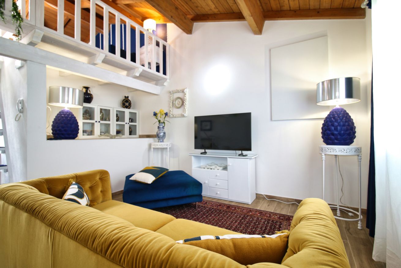 La villa dispone di due camere matrimoniali eleganti, due bagni moderni e un soppalco con divano letto, ideale anche come angolo lettura o spazio relax.